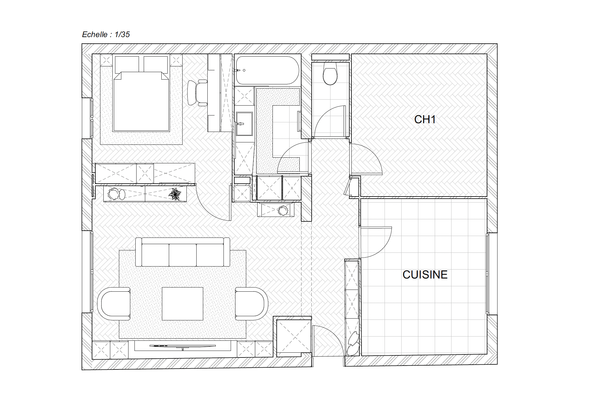 Un parquet stratifié en chevrons est installé. Les murs en terracotta s’associent à un revêtement en briques pour une touche industrielle. Le mobilier en bois naturel intègre un système « push to open ».