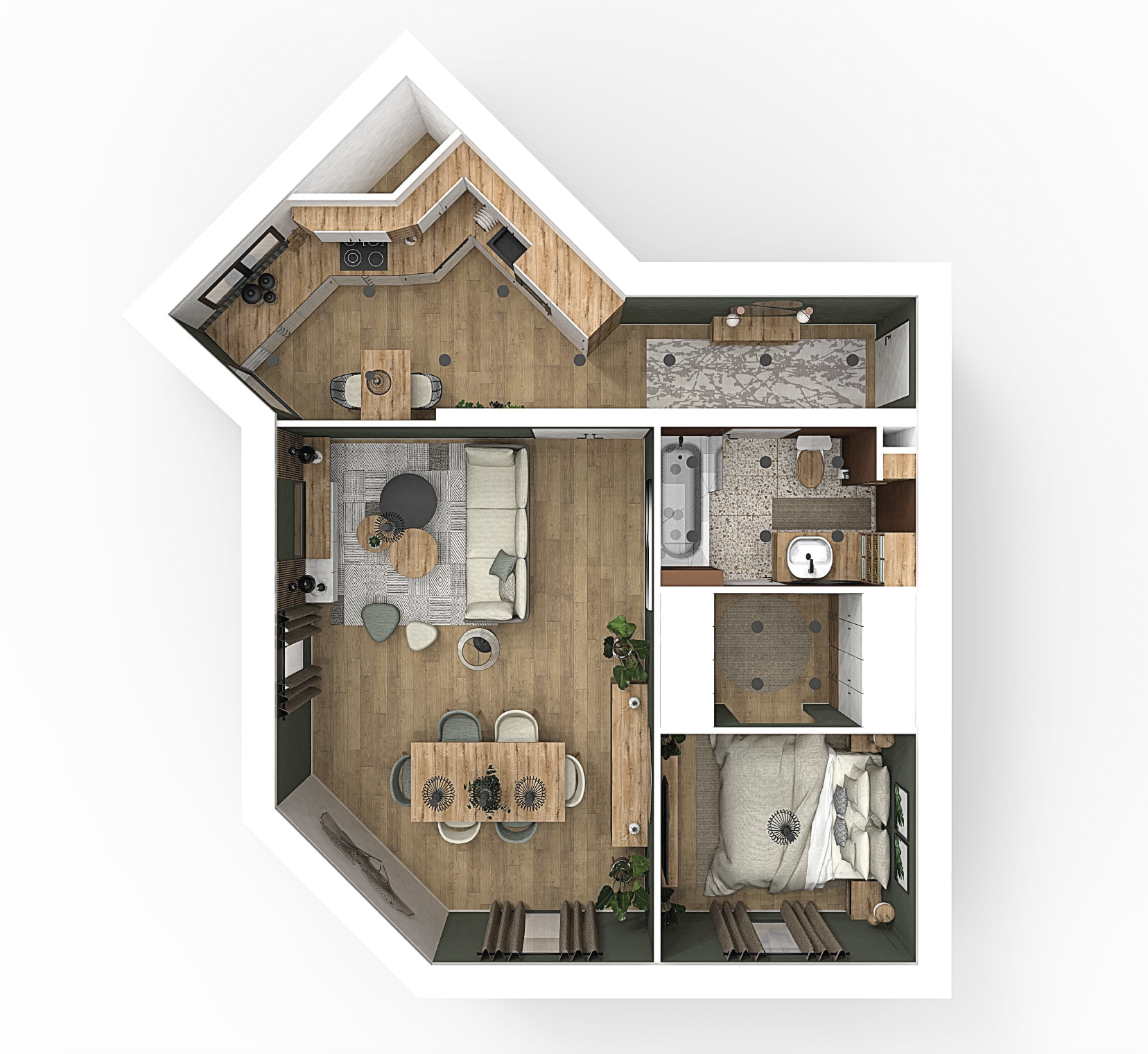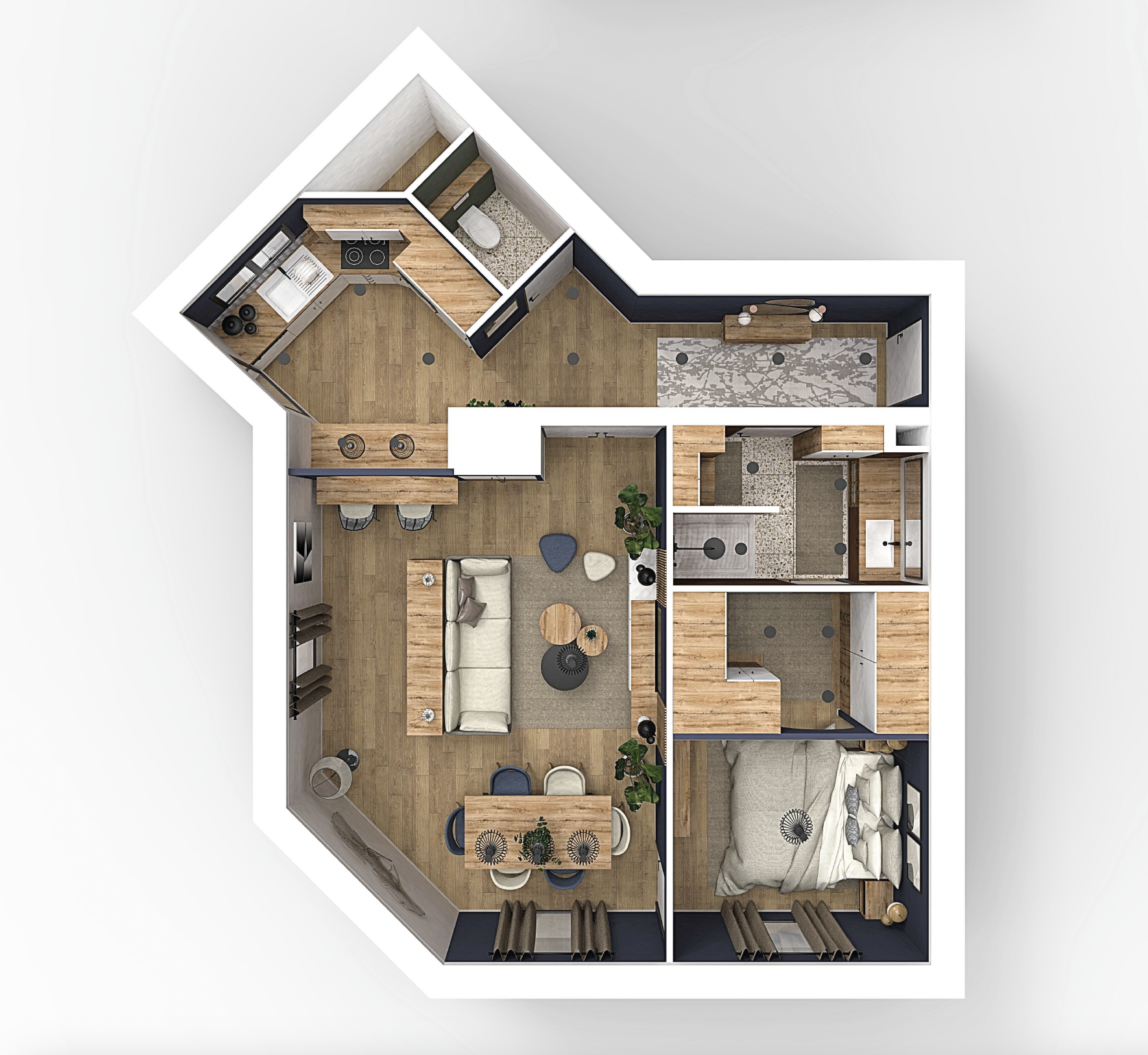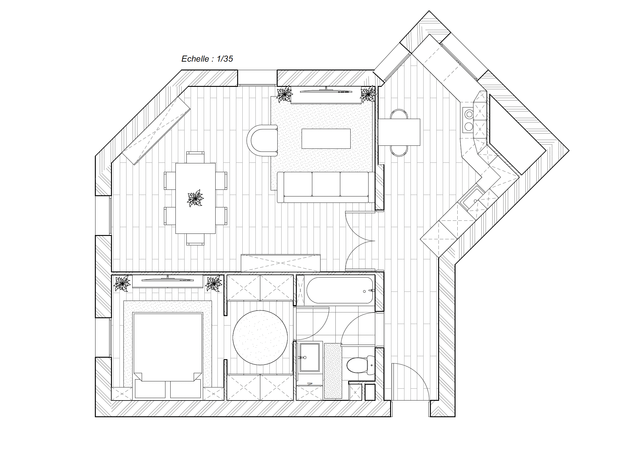 Chaque zone a été pensée pour une circulation fluide et un agencement intelligent. Le dressing maximise les rangements sans alourdir l’espace, et la cuisine s’intègre harmonieusement avec des lignes épurées et des matériaux durables.