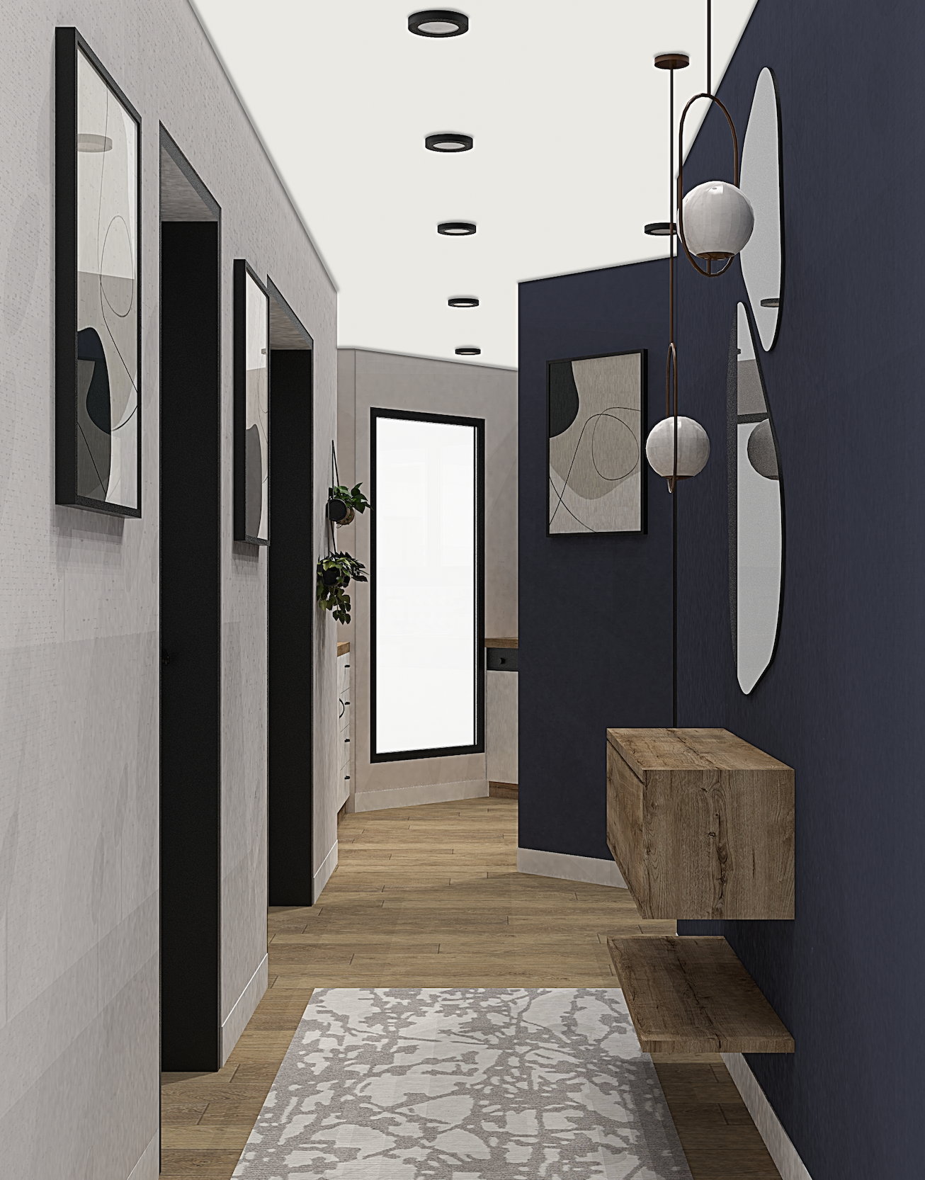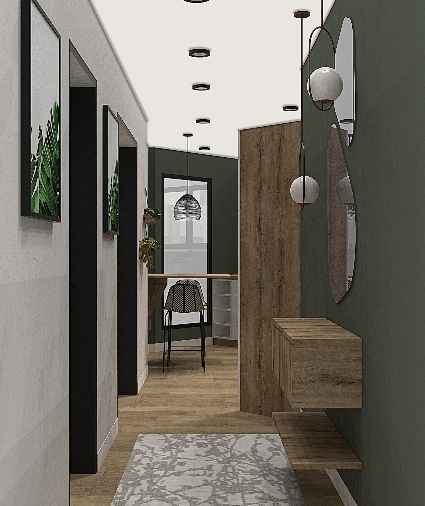 Transformation d’un ancien cabinet médical en appartement fonctionnel et élégant. L’aménagement s’est concentré sur la création d’un dressing, d’une salle de bain et d’une cuisine, avec une modélisation du salon pour assurer la cohérence des circulations. Le style retenu est minimaliste et naturel, mêlant bois et touches végétales pour un intérieur chaleureux. Deux propositions de couleurs ont été explorées : une version avec des nuances de vert et une autre avec du bleu, garantissant une ambiance intemporelle et lumineuse.