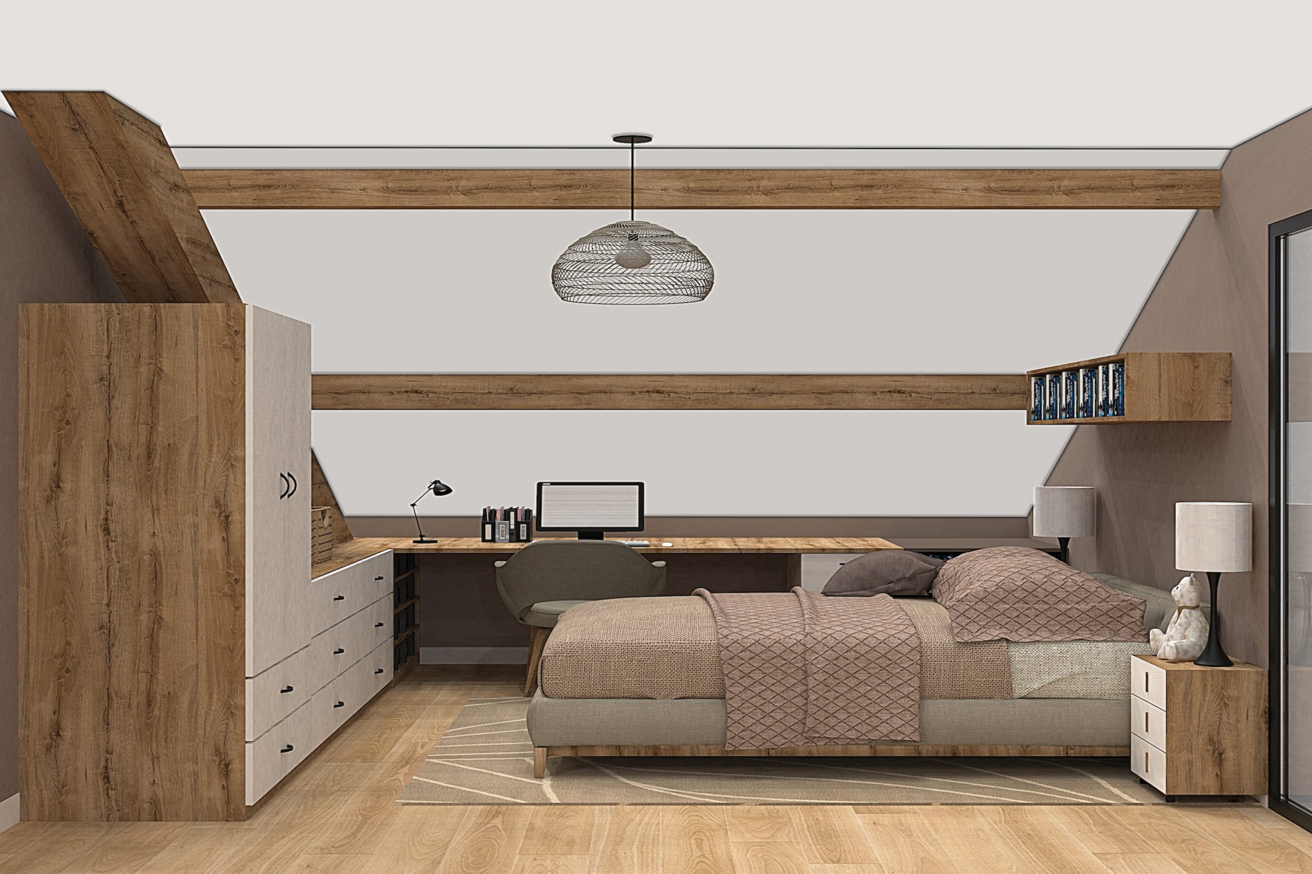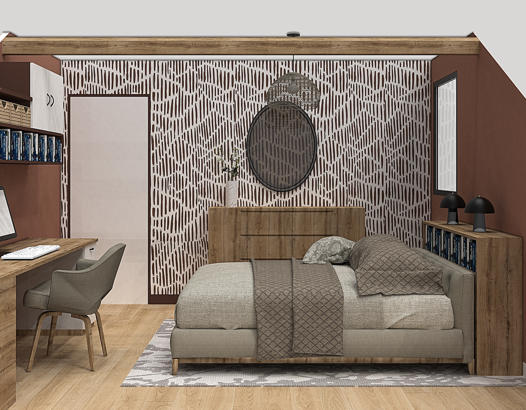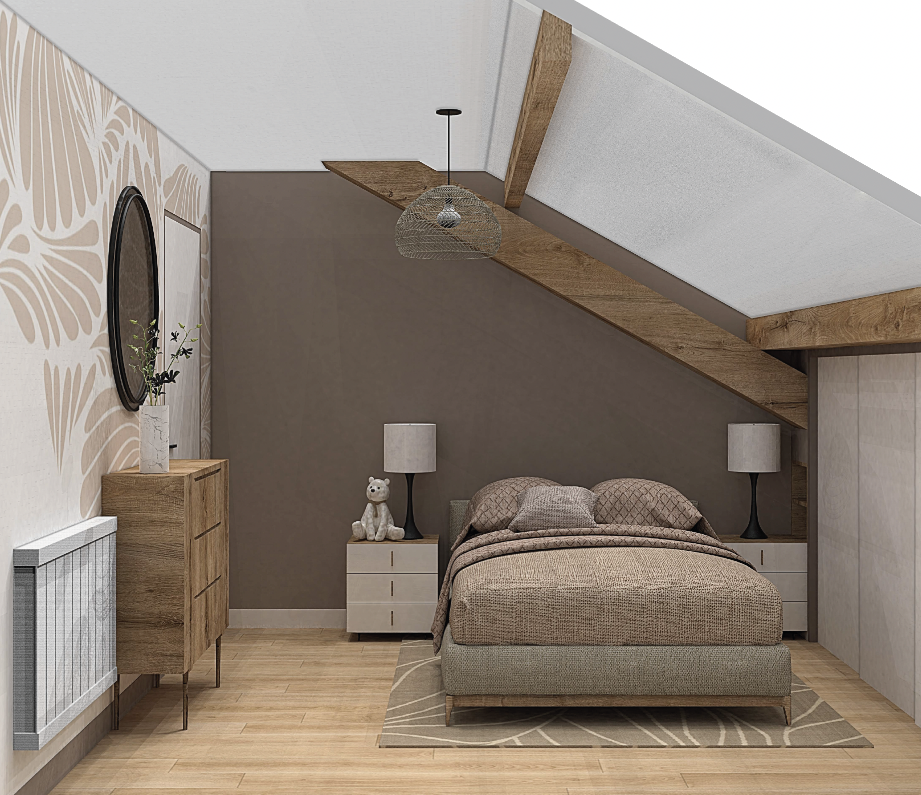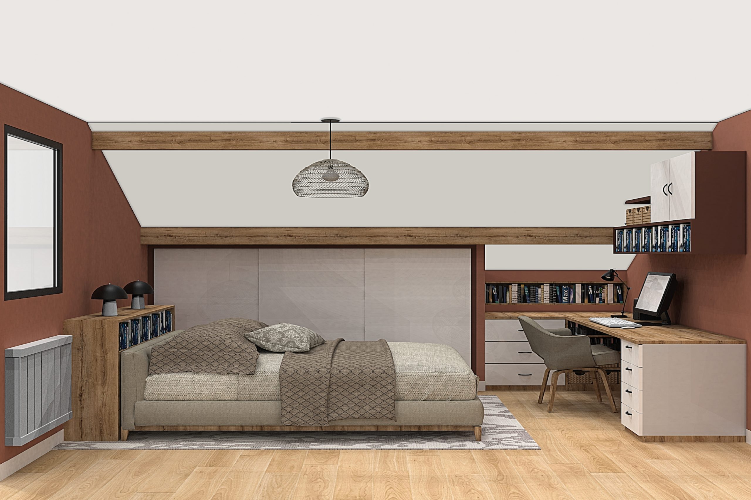 Ce projet s’articule autour de l’optimisation des espaces et du rangement, en tenant compte des contraintes architecturales (toitures sous pente, radiateurs existants) et de l’évolution des enfants. L’objectif était de créer des chambres durables, évolutives et fonctionnelles, tout en conservant une esthétique épurée. Deux propositions d’agencement ont été développées pour chaque pièce, permettant aux clients de choisir l’implantation la plus adaptée à leur mode de vie. L’accent a été mis sur un mobilier sur-mesure et un agencement fluide pour garantir un confort optimal et un usage pratique au quotidien.