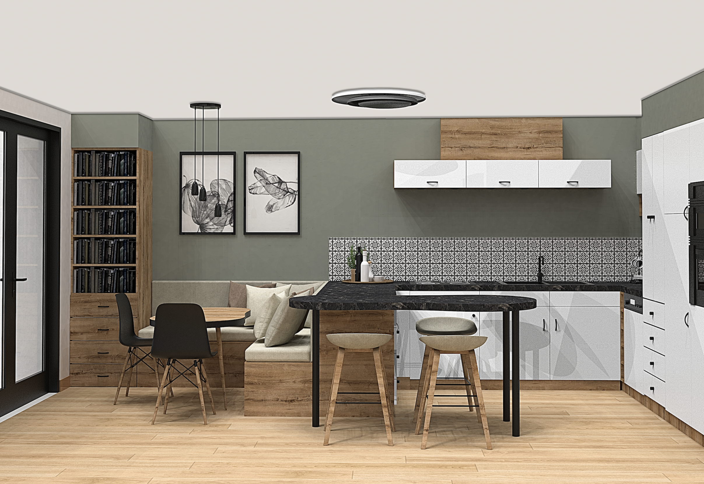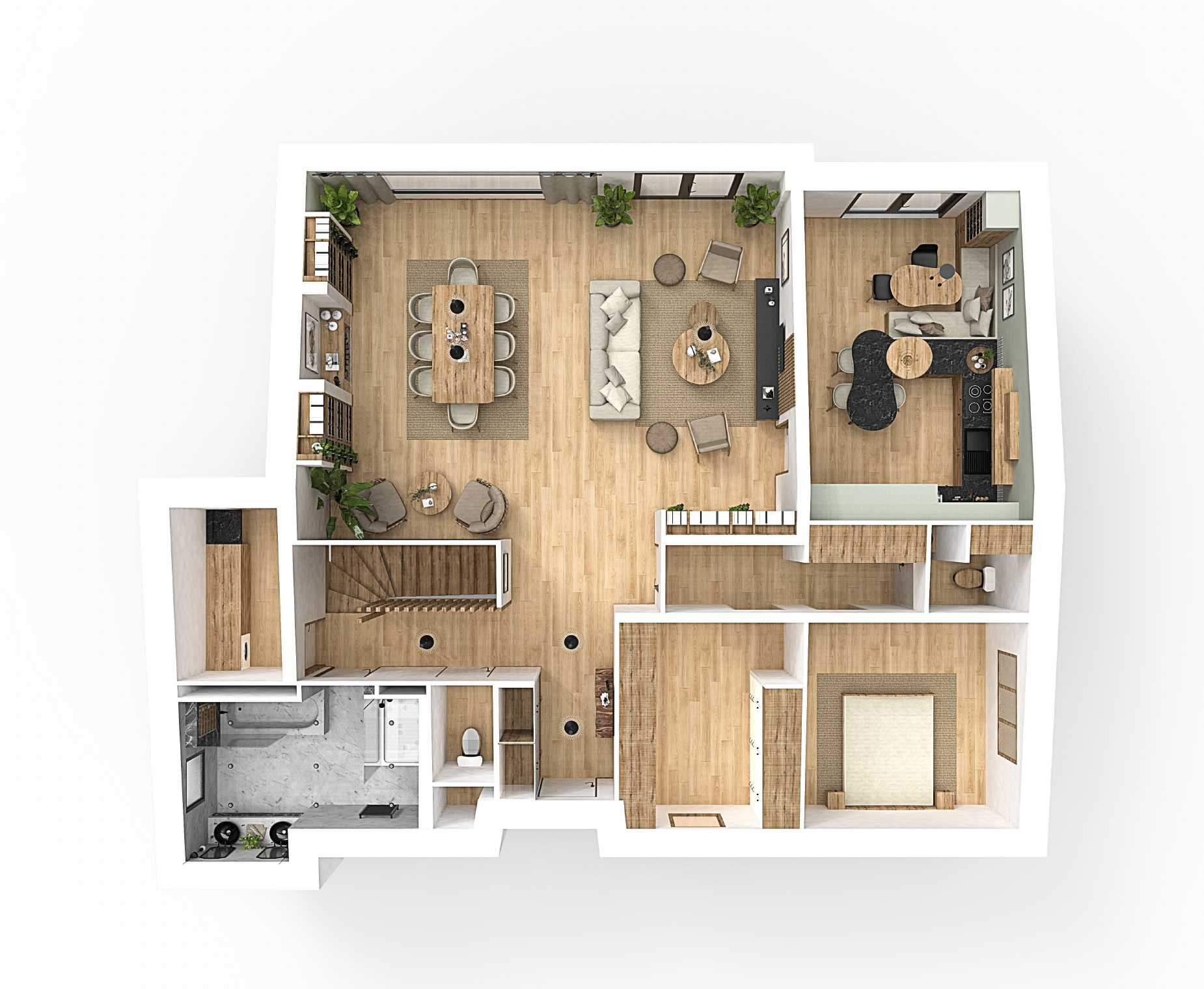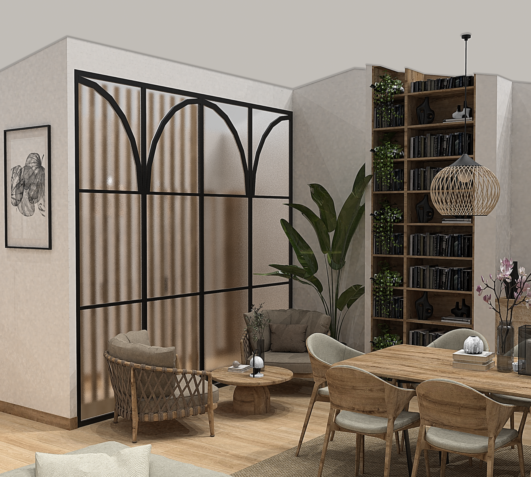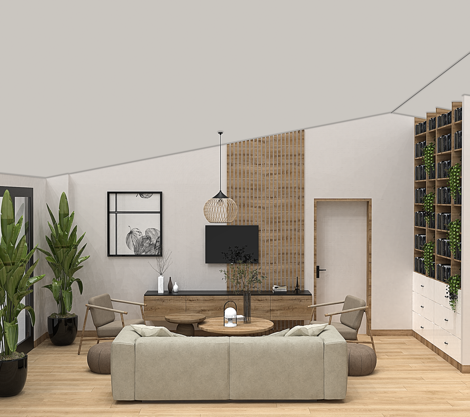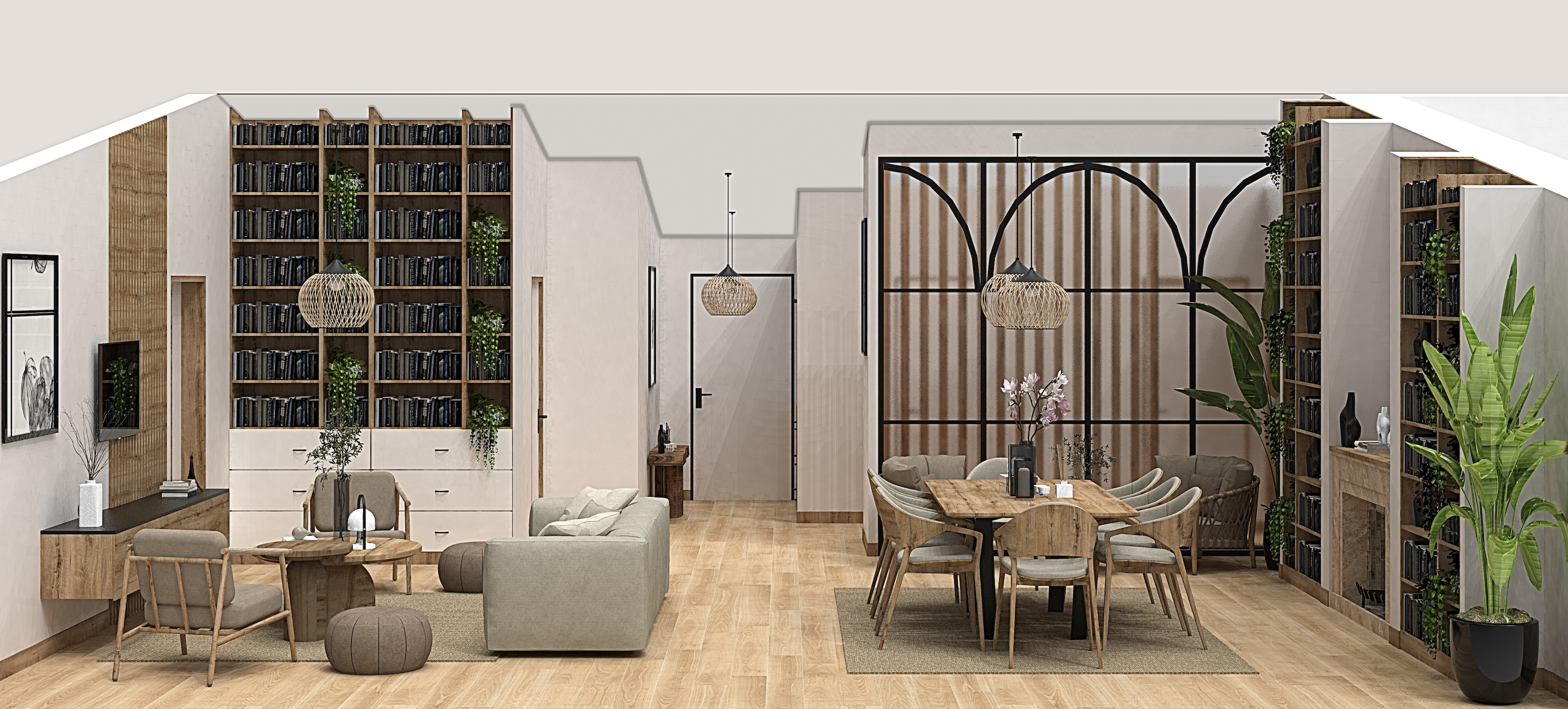 Ce projet de rénovation pour des particuliers s’est concentré sur le salon, la cuisine, l’arrivée de l’escalier et la salle de bain. L’objectif principal était d’optimiser l’éclairage et d’harmoniser les matériaux afin de créer un intérieur chaleureux et lumineux. Une attention particulière a été portée aux revêtements et à la crédence de la cuisine, tout en mettant en valeur le mobilier et l’agencement général des espaces. Le choix des matériaux et du mobilier a été pensé pour allier modernité et chaleur, avec une dominante de bois clair, des touches végétales et un équilibre subtil entre teintes douces et éléments graphiques. Le salon repose sur une base neutre, avec des murs beige et blanc cassé, laissant le mobilier et les accessoires apporter la touche de couleur.