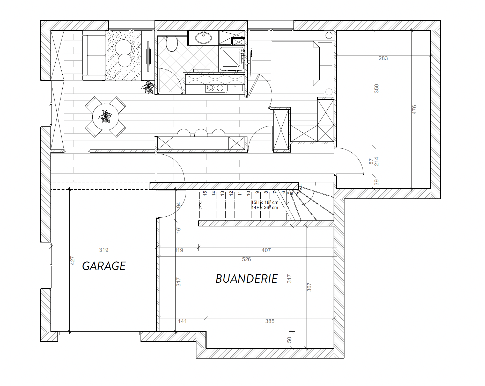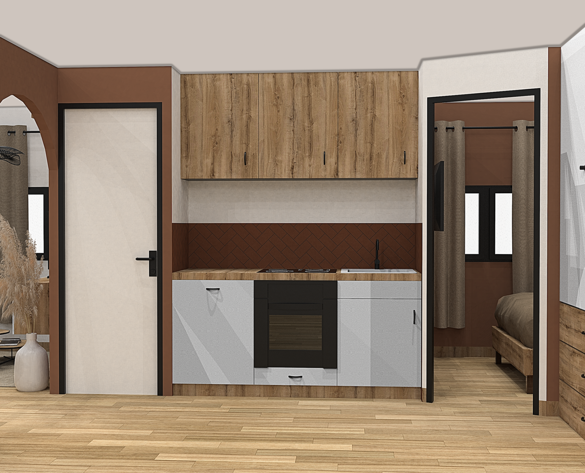 Le véritable défi du projet réside au R-1, où un petit studio indépendant a été conçu pour une jeune fille au pair. L’objectif était de maximiser l’espace tout en offrant un confort optimal et une ambiance chaleureuse.