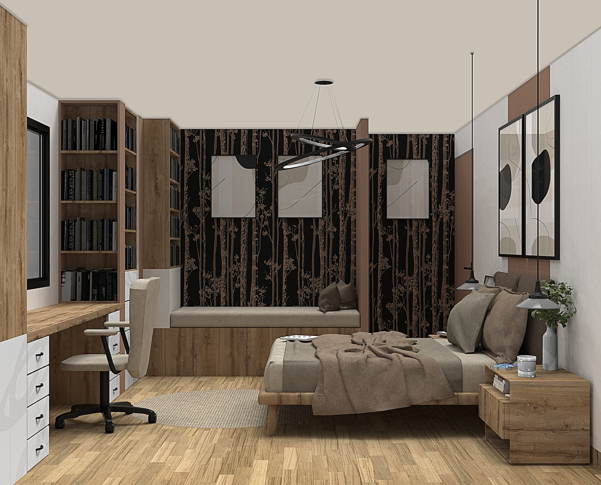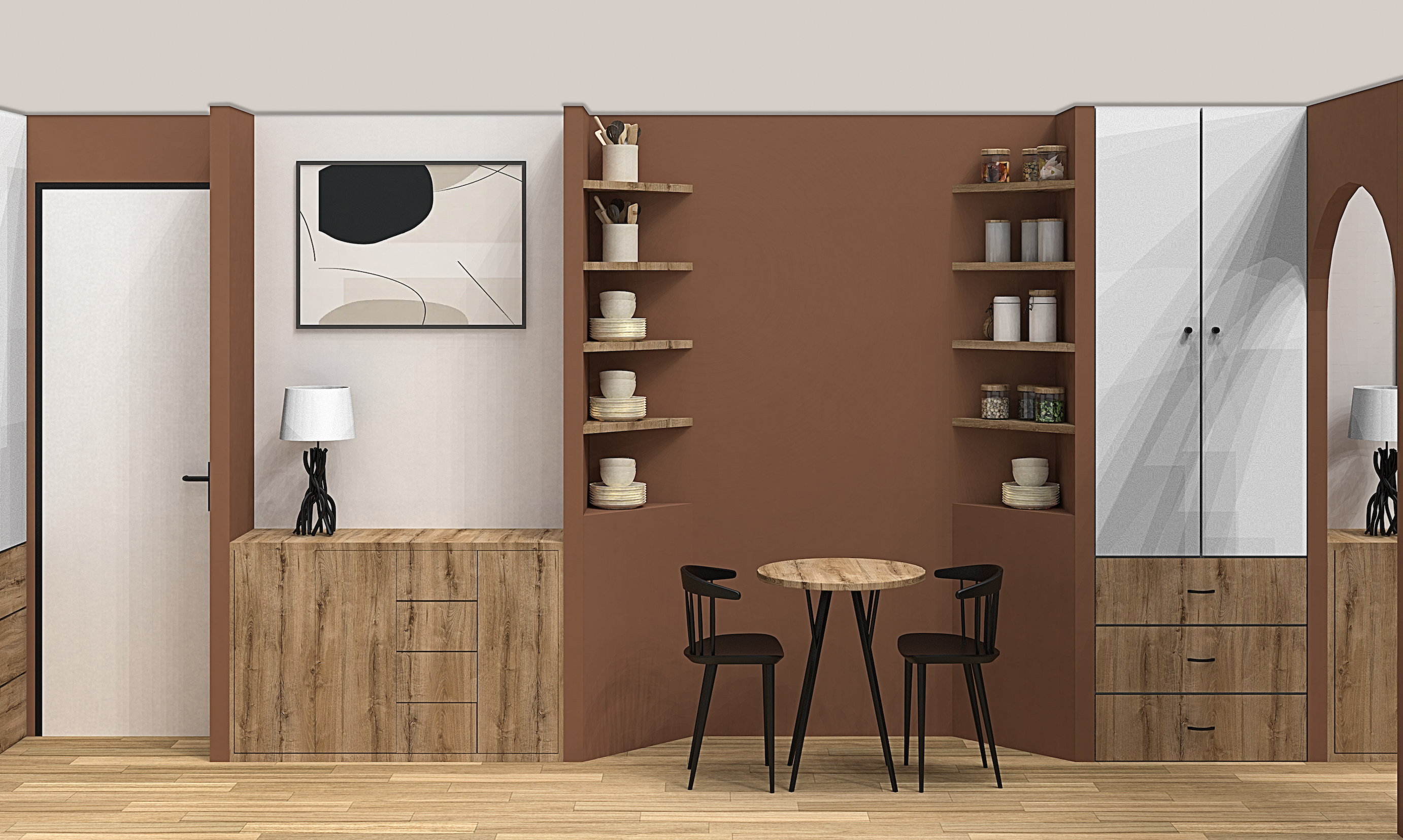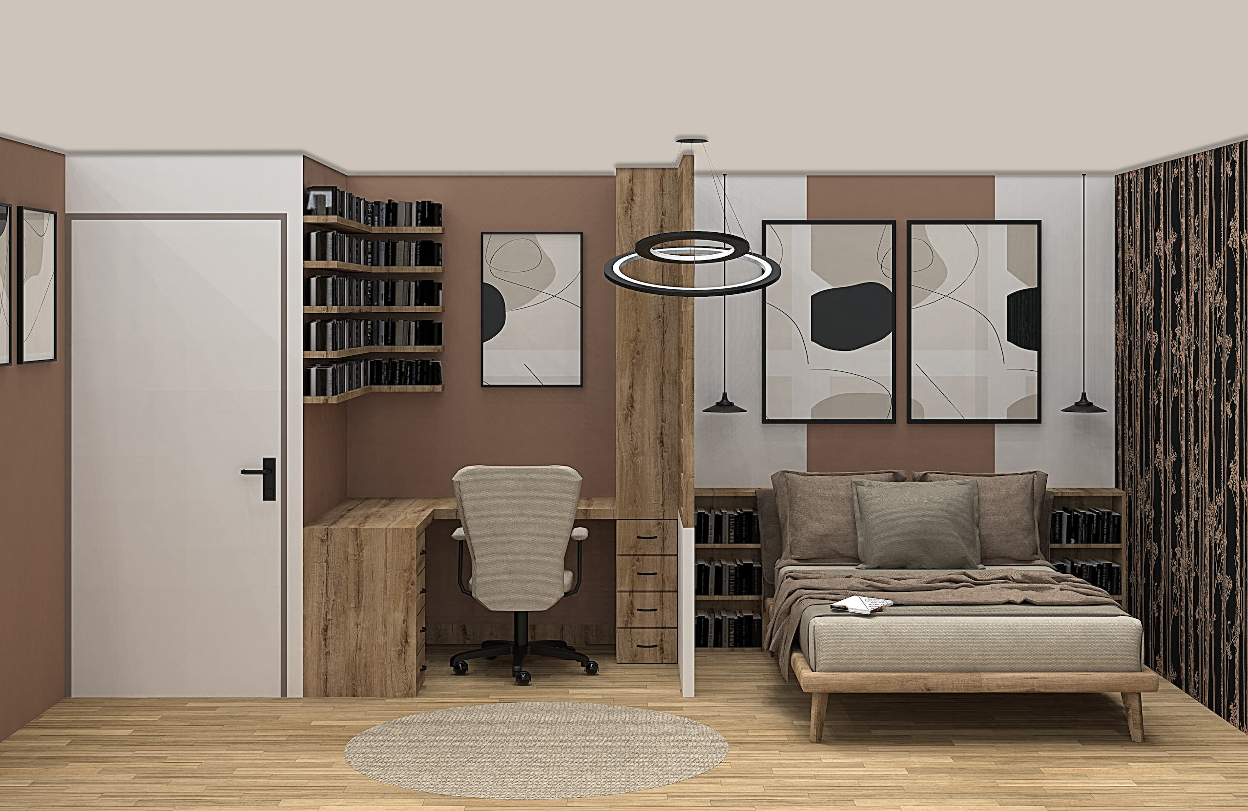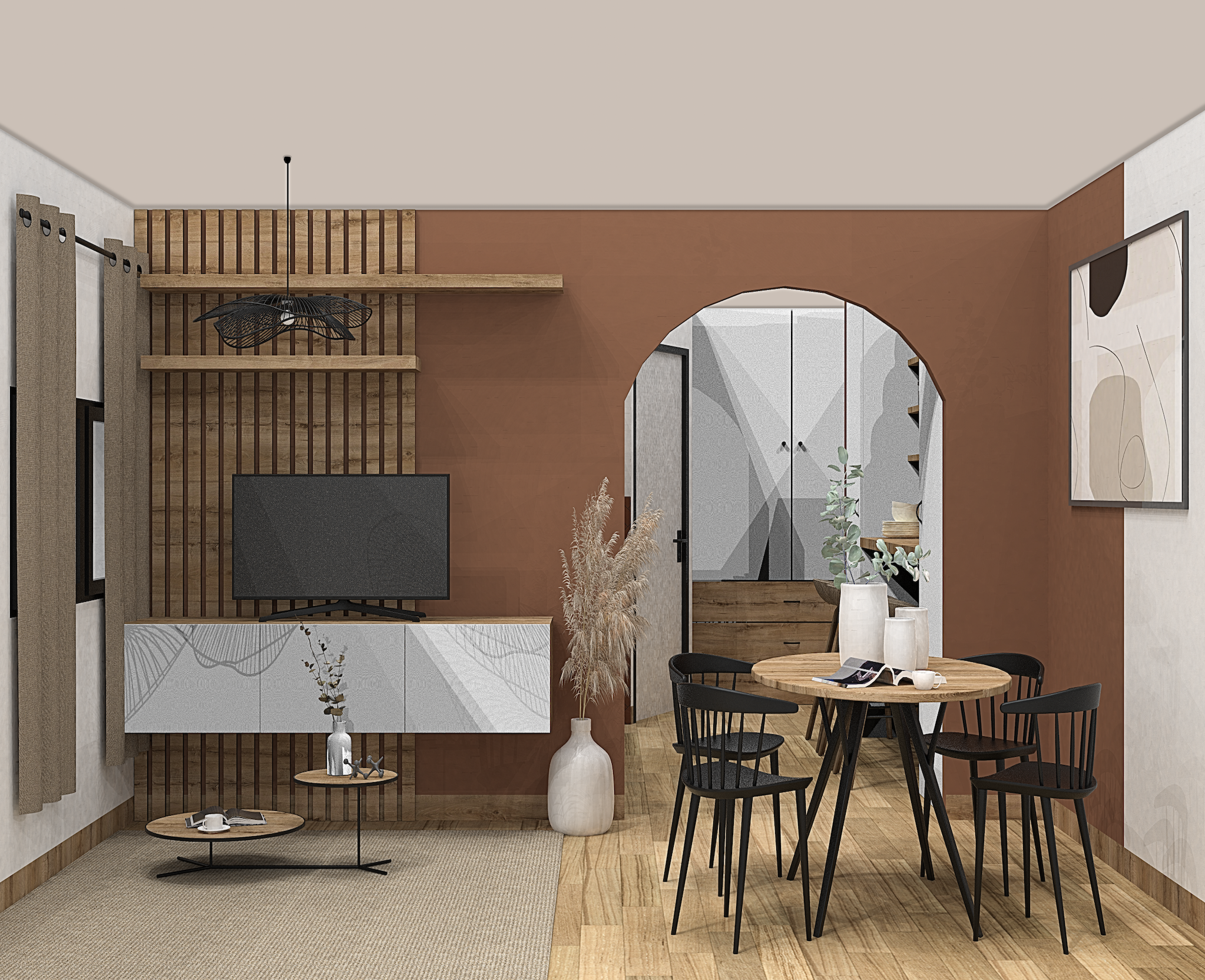 Ce projet de rénovation porte sur la reconfiguration de plusieurs espaces dans une maison sur trois niveaux tout en respectant le style arty des propriétaires. Au rez-de-chaussée, le salon a été réaménagé avec une bibliothèque en métal et bois, entourant une porte coulissante, pour un espace à la fois pratique et esthétique. Le sous-sol a été réaménagé en studio fonctionnel pour une jeune fille au pair, avec un salon, une cuisine, une chambre et une salle d’eau. Les matériaux terra cotta et l’agencement optimisé créent une atmosphère féminine et chaleureuse. À l’étage, la chambre d’adolescente a été aménagée selon ses souhaits, avec des couleurs bois, blanc et terracotta clair, et un papier peint à motif.