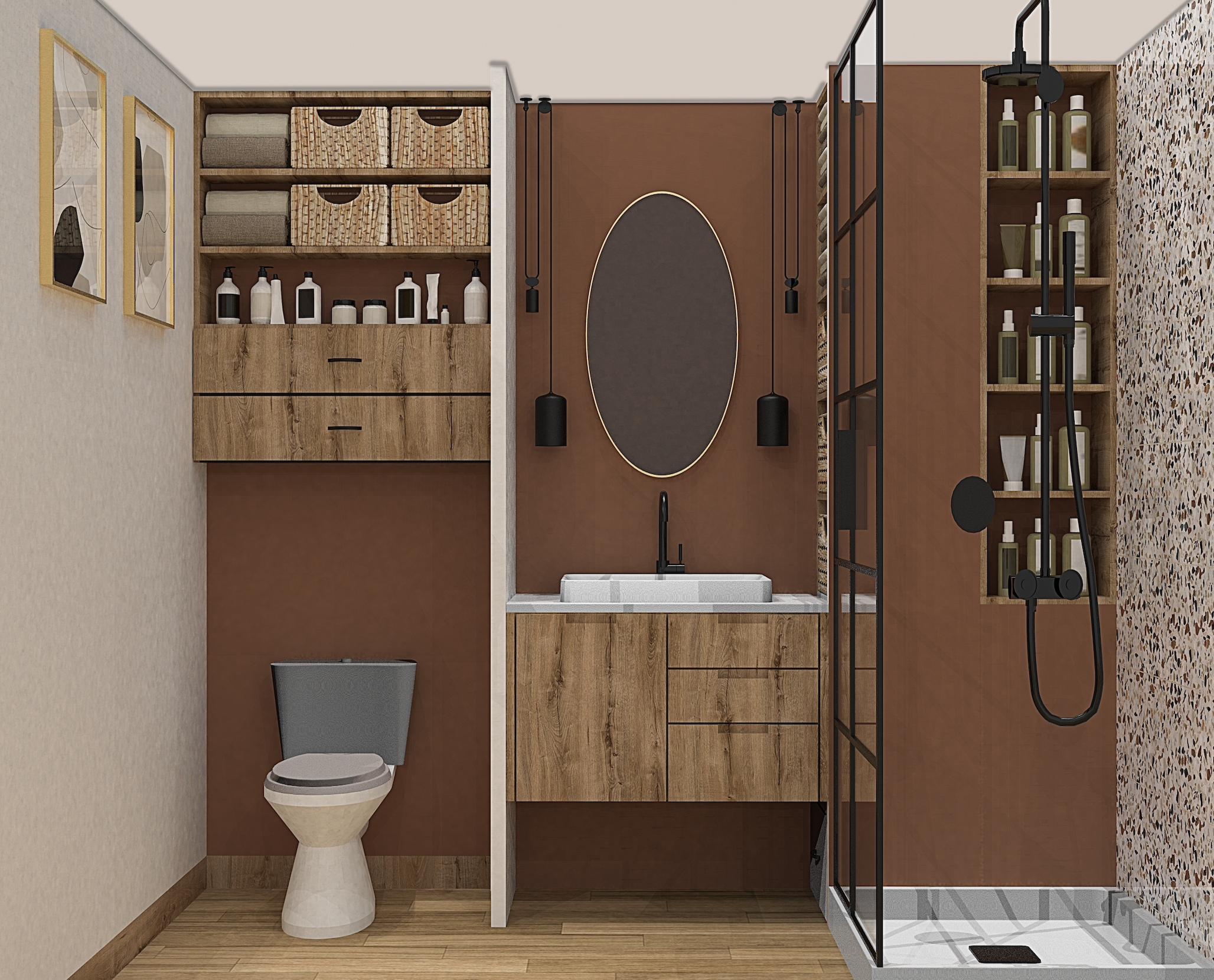 Le choix de matériaux a été dicté par le désir de créer un espace chaleureux et féminin au R-1, avec des tons terracotta et des éléments bois pour une ambiance apaisante.